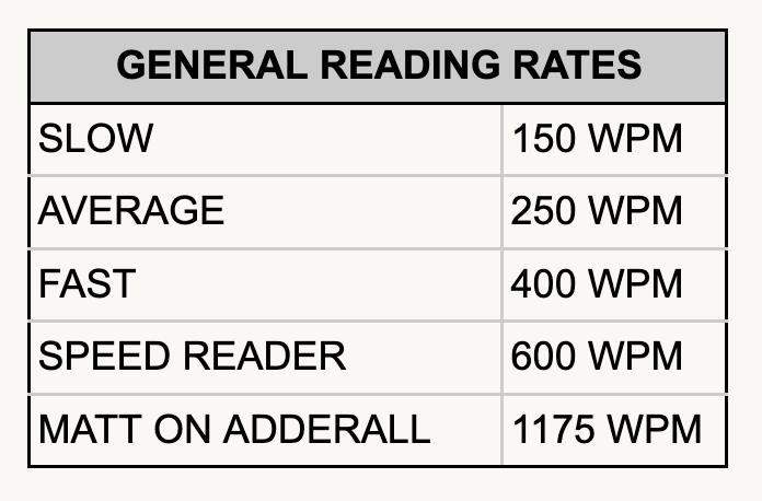 Fortunately, I found one. With my deadline rapidly approaching, I read Crime and Punishment in three hours. I didn’t just read it either. I highlighted, dogeared, Post-It flagged, and compulsively highlighted all but a few of its 211,591 words. That’s 1,175 words per minute. I then wrote a 10-page essay without ever rising from my seat and I submitted it that evening. I received an A. I’d quintupled my processing power. What was my workaround? Amphetamines. Specifically Adderall, from a contraband bottle in my roommate’s sock drawer.